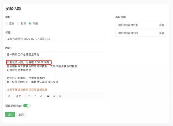 每周,我们会用语雀话题知识库建立一个周报话题,在内容说明中详细标明:不要记流水账,尽量在800字以内。(对于日报,我们的字数限制是 200 字)