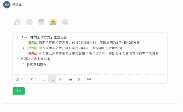 撰写者讨厌写作文,阅读者也讨厌做阅读理解。为帮助阅读周报的同事快速了解重点,我们会为工作内容划重点,标明关键项目当前是已完成还是待完成,用「列表」和「标签」简单排版就可以让周报层级错落有致,重点突出。