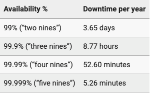 正常运行时间是衡量服务可用性的一项最基本的指标,我们有时也称为“黄金标准”。许多企业都会在服务水平协议(SLA)中提及,或重点标注出各种与服务相关的“正常运行时间”标准。如下图所示,我们在某些术语表中常见的“三个九”或“四个九”等,就是用来衡量某个服务系统每年的正常运行时间、与宕机时间之间的关系。