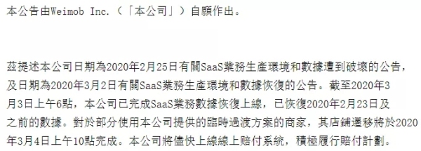 经过7天的“全力抢救”,今早,微盟集团发布公告称,截至2020年3月3日上午6点,该公司已完成SaaS业务数据恢复上线,恢复了2020年2月23日及之前的数据。