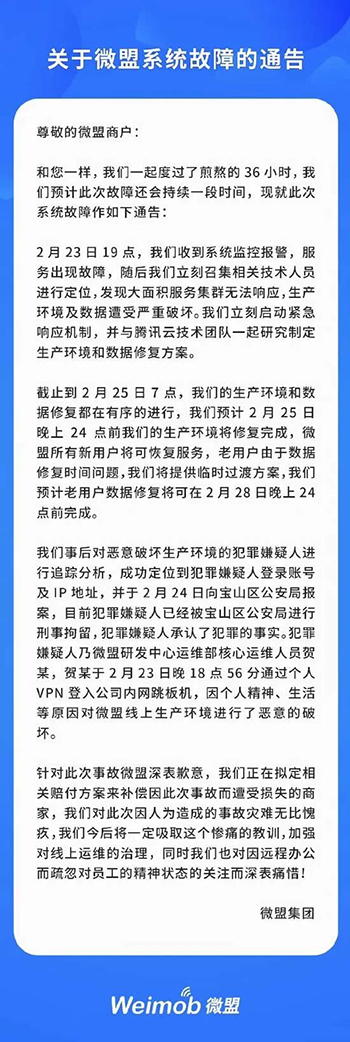 次日,微盟集团发布公告解释这次事故,称数据库遭遇“人为破坏”:公司SAAS业务数据遭研发中心运维部核心运维人员贺某人为破坏,公司已于2月24日向上海宝山区公安局报案,通过登录账号及IP地址追踪,定位并找到了犯罪嫌疑人,其迅速承认了犯罪事实,并被刑事拘留。