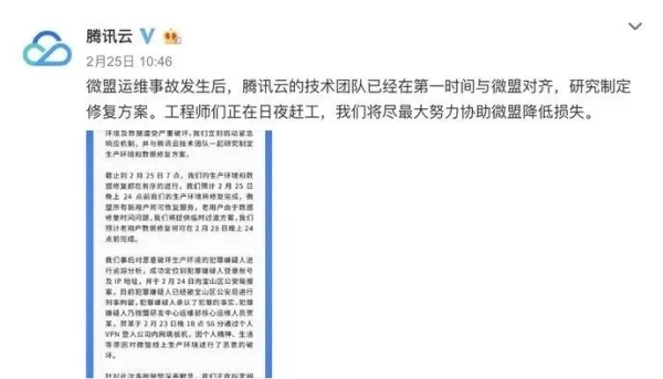 在删库事件爆发当天,微盟与服务提供方腾讯云的技术团队制定修复方案,努力恢复数据,并表示在2月25日晚上24点前新用户可恢复服务,老用户数据恢复将在2月28日晚24点恢复。