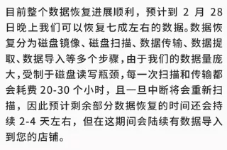 但显然“抢救”进行的并不顺利,之后,微盟又发布公告称,改为预计到28日可恢复七成数据。