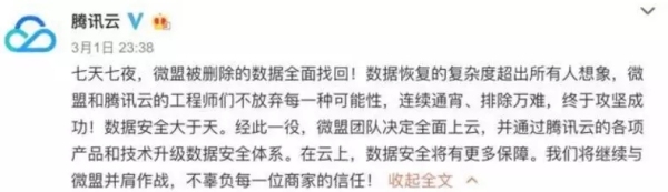 直到3月1日,微盟才发布公告,称数据已全面找回,合作方腾讯云官方微博也表示,“连续通宵、排除万难,终于攻坚成功!”