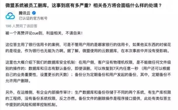 根据@腾讯云在官方账号对于这一事件的另一回复称,“在微盟事件中,微盟使用的云数据库在这次事故中其实没有受到影响”。