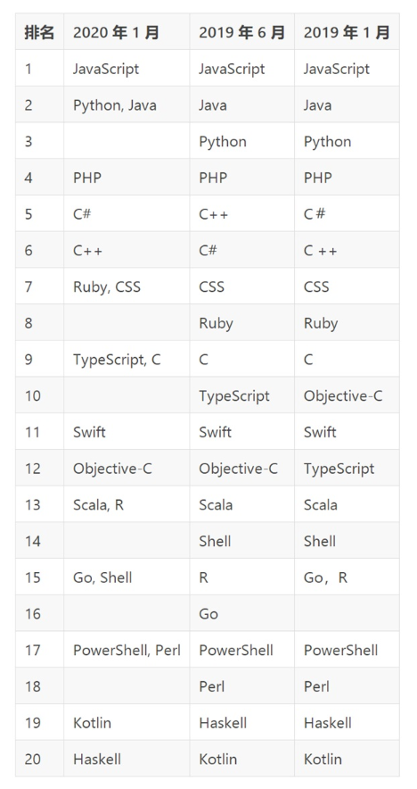 下面先来看看RedMonk 2020年Q1季度的编程语言排行榜前20名:
