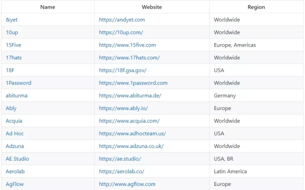 这是一份技术领域内或周围的半远程或完全远程的公司名单,部分企业名单如图所示。