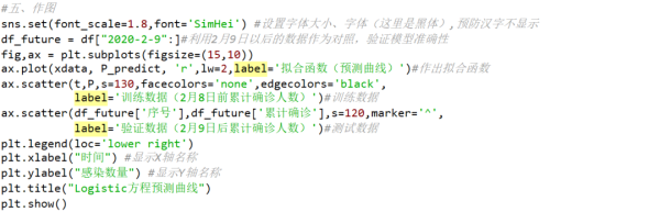 程序中,首先定义待拟合函数,然后获取“累计确诊”人数数据,并利用curve_fit()函数进行参数拟合,得出需要拟合的参数。最后将拟合曲线和实际确诊人数在同一图中显示,直观观测出模型效果。