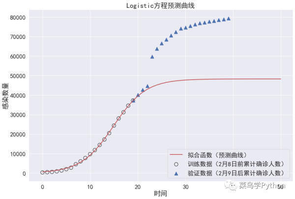 通过将1月20日至2月8日的数据进行Logistic方程拟合,在2月9-11日三天预测数据和实际数据较为吻合。但在2月12日,官方的数据突然激增,这让我们的模型失效。