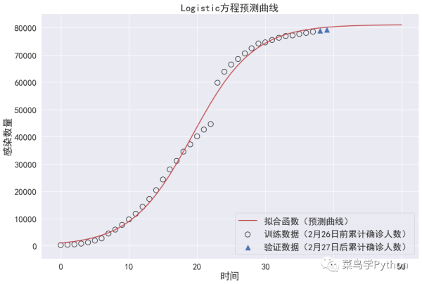 在重新调整训练数据,我们选择将1月20日至2月26日的数据作为训练数据,2月27-28日数据作为对照数据,可得到新的拟合曲线,预测值和实际值都相对较为吻合。