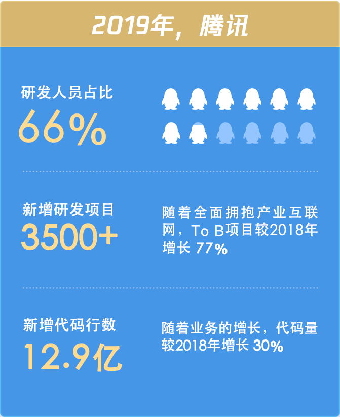 在代码数量上,2019 年腾讯新增代码行数 12.9 亿,相比 2018 年增长了 30%。
