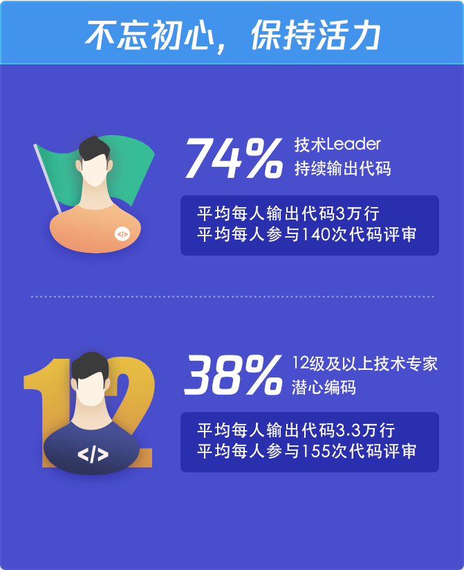 在技术管理人员的研发参与度上,腾讯 74% 的技术 Leader 仍在持续输出代码,2019 全年,平均每人输出代码 3 万行,参与 140 次代码评审;38% 的 12 级及以上技术专家潜心编码,平均每人输出代码 3.3 万行,参与 155 次代码评审。