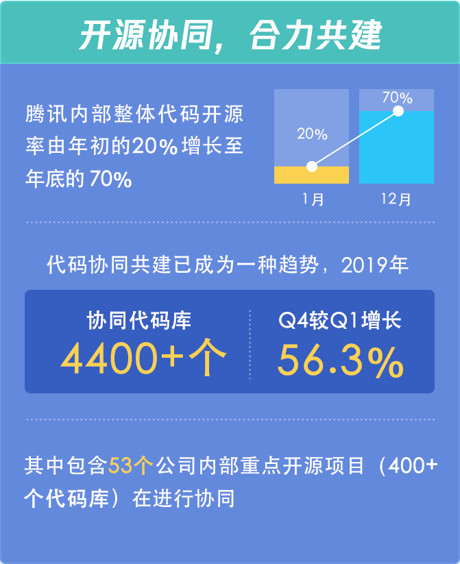 在内部开源方面,腾讯内部整体代码开源率由 2019 年年初的 20% 增长至年底的 70%。其中,2019 年腾讯内部新增协同代码库超过 4400 个,Q4 较 Q1 增长了 56.3%。其中包含 53 个公司内部重点开源项目(涉及 400 多个代码库)在进行协同。