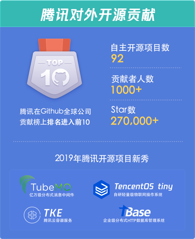 在外部开源方面,截至 2019 年年底,腾讯在 GitHub 上开源项目数为 92 个,贡献者超过 1000 个,获得 Star 数超过 27 万,在 GitHub 全球公司贡献榜上的排名前十。