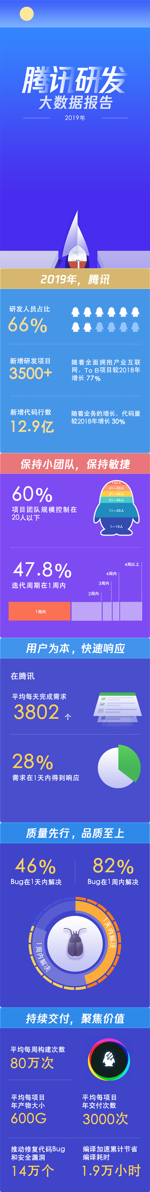 数据显示,腾讯 60% 的项目团队规模在 20 人以下,47.8% 的项目迭代周期在 1 周之内,平均每天完成用户需求 3802 个,而 28% 的需求可以在 1 天内得到响应。另外在 Bug 处理方面,46% 的 Bug 在 1 天内得到解决,82% 的 Bug 在 1 周内得到解决。