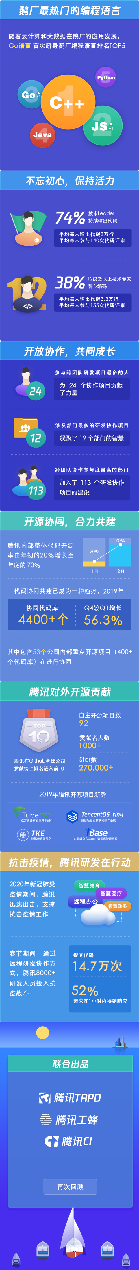随着腾讯云计算和大数据相关业务的迅速发展,Go 语言首次跻身腾讯编程语言排名 TOP5;整个 2019 年,腾讯内部使用最多的五种编程语言分别是:C++、JavaScript、Go、Java 与 Python。