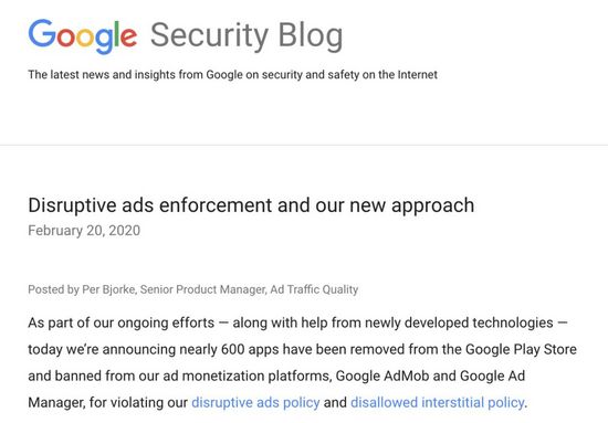 2月20日,谷歌以存在App外广告等干扰性广告问题为由移除了近600款安卓应用,并禁止其开发者进入Play软件商店及其广告联盟服务。