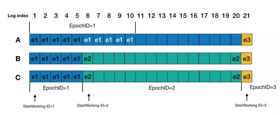以上个例子来说明,在 Round 3,A 作为 leader 启动时,需要日志回放重确认,index 1~5 的日志不用说的,epochID 为 1,然后进入 epochID 为 2 阶段,index 6 会确认为 epochID 为 2 的 StartWorking 日志,然后就是 index 7~10,因为这个是 epochID 为 1 的日志,比上一条日志 epochID 小,会被忽略掉。而 Index 11~19 的日志,EpochID 应该是要沿袭自己作为 Leader 看到的上上一轮 StartWorkingID(当然,ProposeID 还是要维持在 3 的),或者因为是 noop 日志,可以特殊化处理,即这部分日志不参与 epochID 的大小比较。然后 index 20 日志也会被重新确认。最后,在 index 21 写入 StartWorking 日志,并且被大多数确认后,A 作为 leader 开始接收请求。