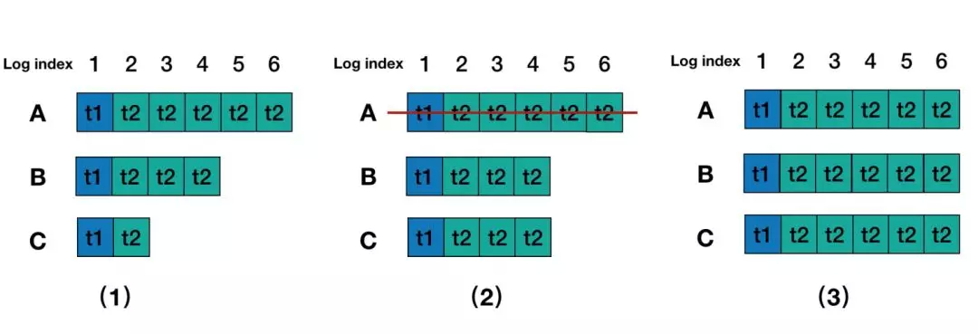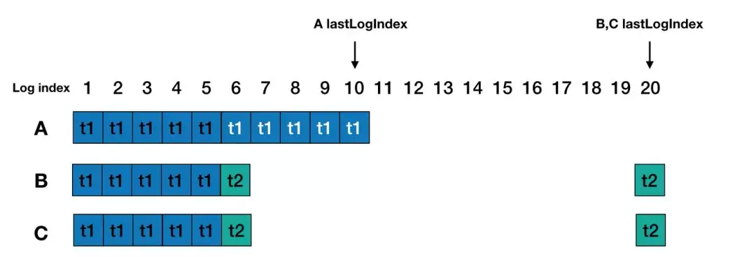 针对第一小节的场景,Raft 中是不会出现第三轮 A 当选 leader 的情况,首先对于选举,候选人对比的是最后一条日志的任期号 (lastLogTerm) 和日志的长度 (lastLogIndex)。B、C 的 lastLogTerm(t2)和 lastLogIndex(20)都比 A 的 lastLogTerm(t1)和 lastLogIndex(10)大,因此 leader 只能出现在 B、C 之内。假设 C 成为 leader 后,Leader 运行过程中会进行副本的修复,对于 A 来说,就是从 log index 为 6 的位置开始,C 将会把自己的 index 为 6 及以后的 log entry 复制给 A,因此 A 原来的 index 6-10 的日志删除,并保持与 C 一致。最后 C 会向 follower 发送 noop 的 log entry,如果被大多数都接收提交后,才开始正常工作,因此不会出现 index 7-10 能读到值的情况。