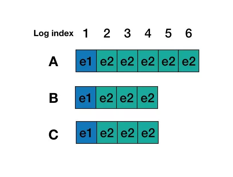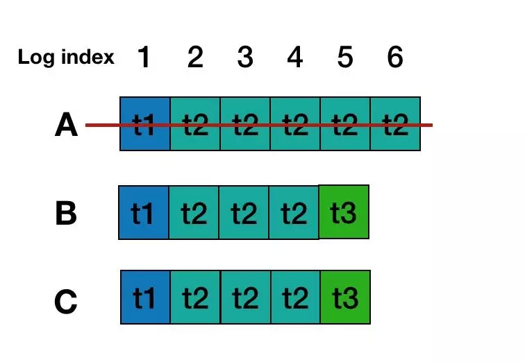 2)Round 2,B 成为 Leader, B 中 Log entry 3, 4 内容复制到 C 中, 并且在 B 为主的期间内没有写入任何内容。