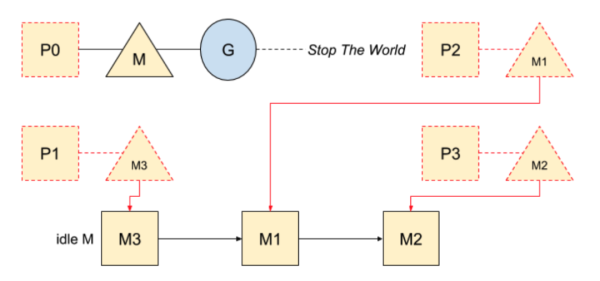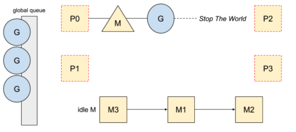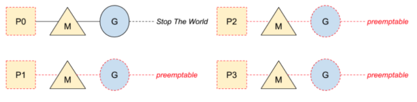 一旦 goroutine 被抢占,它们将在安全点停止。同时,P 处理器将(正在运行的代码或在空闲列表)被标记为已停止,以不运行任何代码: