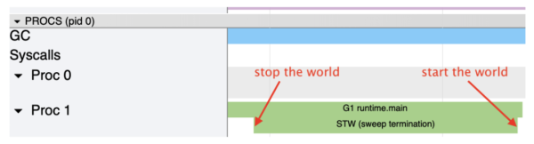 然后,一旦世界停止了,只有唯一活动的 goroutine 才能安全地运行,并在工作完成后启动整个世界。下面跟踪图将有助于理解此阶段发生在何时: