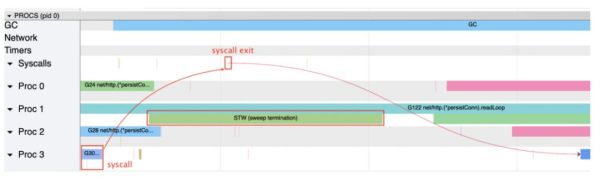 “STW”阶段也可能会影响系统调用,因为它们可能会在 STW 时返回。让我们以一个密集执行系统调用的例子,并查看其如何处理: