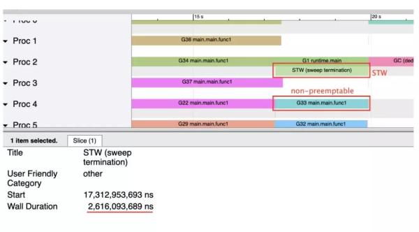 func main() { var t int for i := 0;i < 20 ;i++ { go func() { for i := 0;i < 1000000000 ;i++ { t++ } }() } runtime.GC() }在这里,“ Stop the World”阶段需要 2.6 秒: