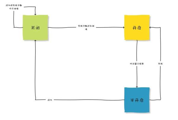 在此状态下断路器会允许部分的请求,如果这些请求都能成功通过,那么就意味着错误已经不存在,则会被切换回关闭状态并重置计数。倘若请求中有“任一”的错误发生,则会回复到“开启”状态,并且重新计时,给予系统一段休息时间。