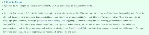 但是,在2018年底,Hystrix在其Github主页宣布,不再开放新功能,推荐开发者使用其他仍然活跃的开源项目。