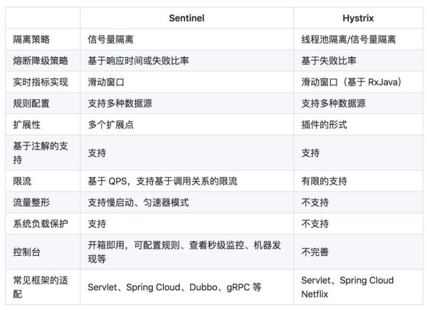 下图是Sentinel的GitHub主页中关于Sentinel和Hystrix的对比: