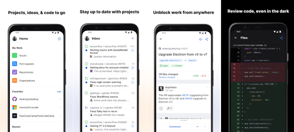 GitHub 移动版客户端采用原生开发,界面方面没有照搬 PC 端网站的设计,而是针对移动端提供了专为触摸屏设计的新界面,还提供了通知功能,当用户被直接 @ 的时候,就能够收到悬浮通知,方便开发者随时随地查看代码、合并更改以及共享协作等。当然还包含对关闭通知、标记任务状态等滑动操作的支持。