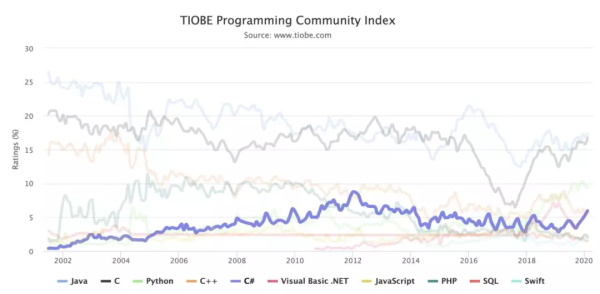 我刚刚查了一下(见下图),C# 还是挺热门的编程语言,没到不太好就业的地步,别随便听信别人的话,要学会自己去判断。Python 是门不错的编程语言,增长势头很猛,但远没到那种独霸天下的地步。