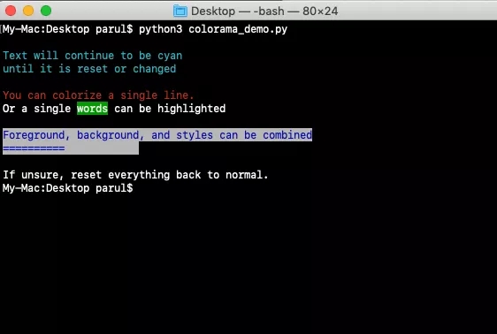 import colorama from colorama import Fore, Back, Style colorama.init() # Set the color semi-permanently print(Fore.CYAN) print("The Text will appear in cyan until it is reset") print(Style.RESET_ALL) # Colorize a single line and then reset print(Fore.RED + 'Colorize a single line in RED' + Style.RESET_ALL) # Colorize a single word in the output print('You can also colorize a single word' + Back.GREEN + 'words' + Style.RESET_ALL + ' can be highlighted') # Combine foreground and background color print(Fore.BLUE + Back.WHITE) print('Foreground, background, and styles can be combined') print("========== ") print(Style.RESET_ALL) print('Reset everything back to normal.')输出如下: