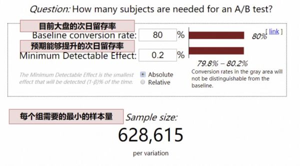 (这里的留存率可以转换为点击率、渗透率等等,只要是比例值就可以,如果估不准,为了保证实验能够得到结果,此处可低估,不可高估,也就是 0.2pp 是预期能够提升地最小值)