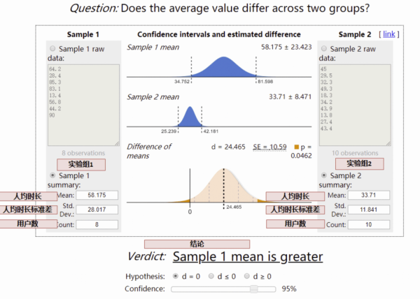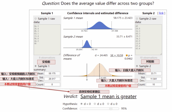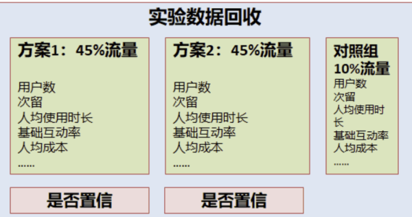 通过上假设检验,如果结论置信,我们就能够得到方案 1 和方案 2 在哪像指标更好(有显著性差异), 对于不置信的结论,尽管方案 1 和方案 2 的指标可能略有差异,但可能是数据正常波动产生。