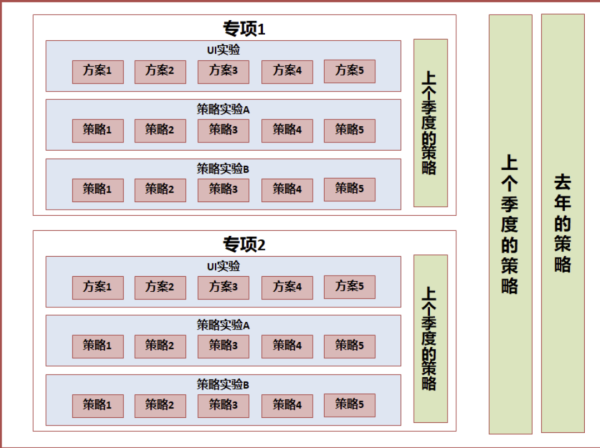 上面谈到了【贯穿层】的设计,贯穿层的设计其实不但可以应用在多个活动的场景,有些场景,我们的业务需要和去年或上个季度的自身对比,同时业务还不断在多个方面运用 AB Test 迭代。