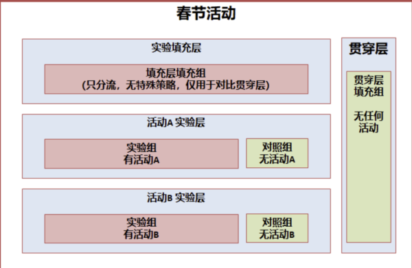 这个时候,我们准确量化春节活动的贡献,就需要一个【贯穿】所有活动的对照组,在 AB 实验系统中通俗称作贯穿层。