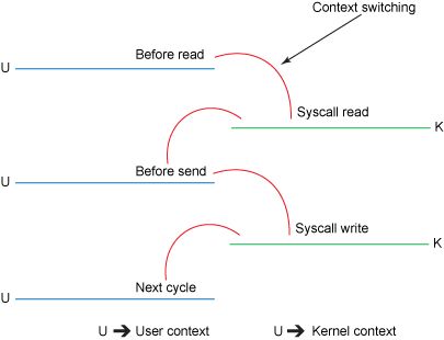 虽然这副图看起来很简单,但是在内部,复制操作需要在用户态和内核态之间进行四次上下文切换,并且在操作完成之前要复制四次数据。