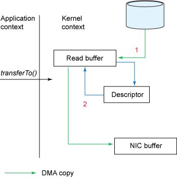 在这个模型中,上下文切换的数量减少到一个。具体来说,transferTo() 方法指示块设备通过 DMA 引擎将数据读入读缓冲区。