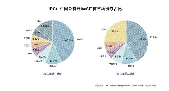 1. 在2019年Q2,阿里云份额拿到了43%的低点,同期腾讯云占到17.2%,差距缩小;