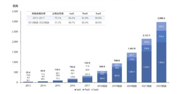 从大概规模看,若以中国信通院数据为参考,IaaS层270亿元的规模同比增速若在70%,则2019年为459亿元,2018年PaaS层的22亿元,到2019年大概为45亿元。