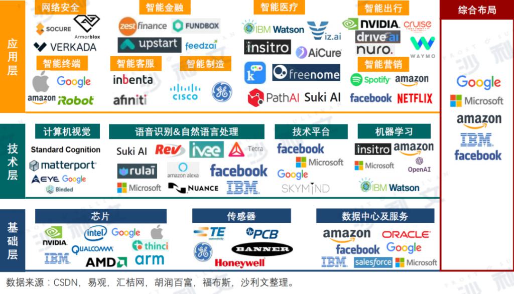 美国:人工智能厂商较多,软硬实力兼具,大型厂商多综合布局AI产业,创业公司遍布基础层、技术层和应用层。