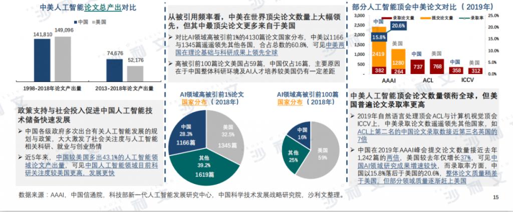 中国人工智能论文近五年在产出量和增速上大幅领先美国,整体论文质量仍有差距,但顶尖论文水平正逐步接近。
