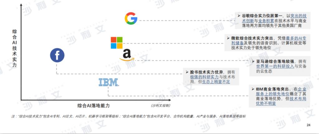 谷歌稳居第一,微软亚马逊紧随其后,而脸书与IBM分别由于生态与技术深度的欠缺稍显落后。