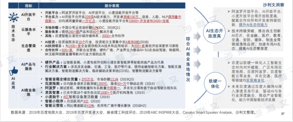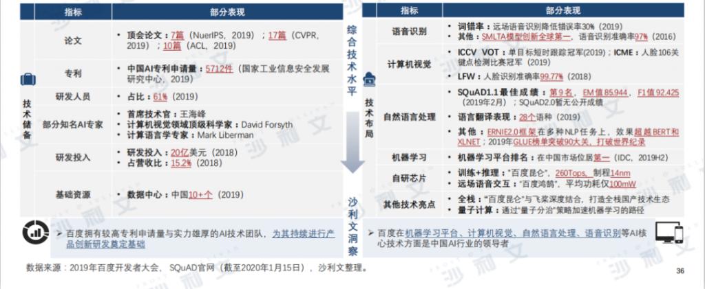 凭借扎实的AI技术储备,百度全面布局AI技术,打造软硬一体的人工智能大生产平台,是中国人工智能技术领域的先行者,综合技术实力排名第一。