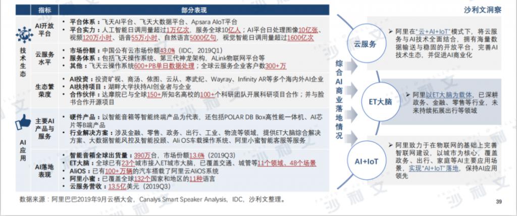 阿里以云计算为基础,完善AI开放平台,并积极对外投资繁荣AI生态;在应用层面以ET大脑为核心,拓展至IoT各领域,实现"AI+IoT"全面落地。