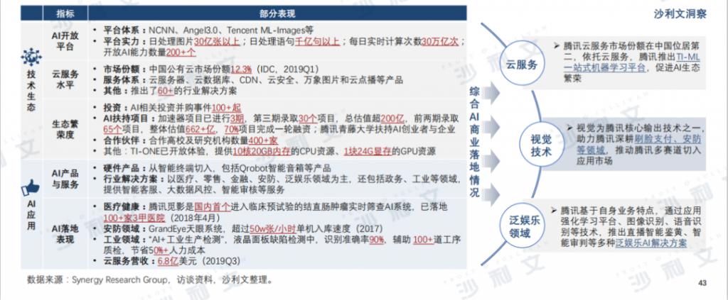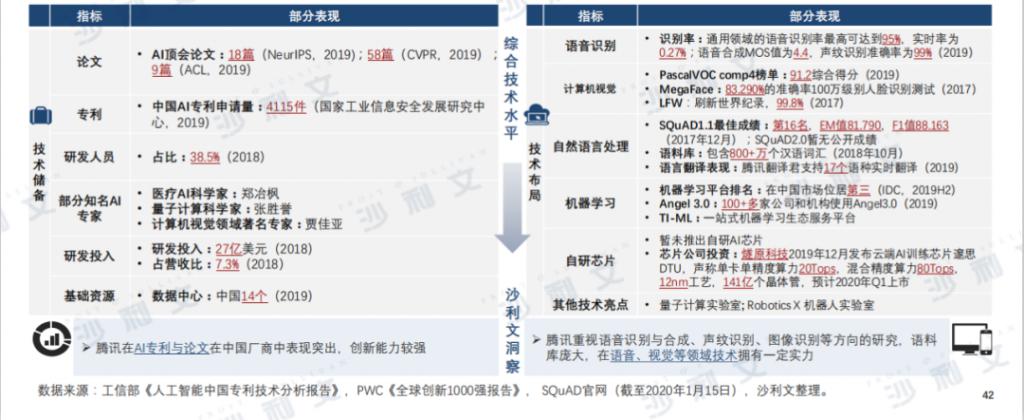 腾讯AI顶会表现活跃、AI专利数量丰富;在技术布局层面有三大实验室加持,专注视觉与语音研究。