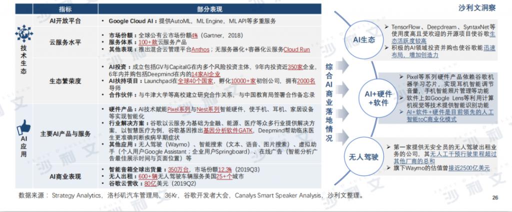 众多的优秀开源项目与活跃的一级市场投资使谷歌拥有繁荣的AI生态;谷歌以"AI+硬件+软件"的形式实现较高的AI商业化水平。