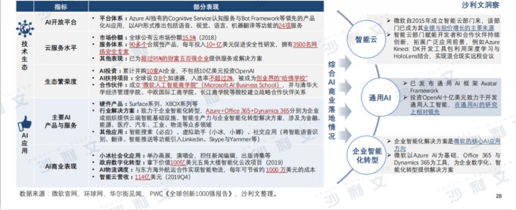 微软以智能云为核心实现AI赋能,为企业或组织数字化、智能化转型提供解决方案,同时构建繁荣度较高的AI生态。
